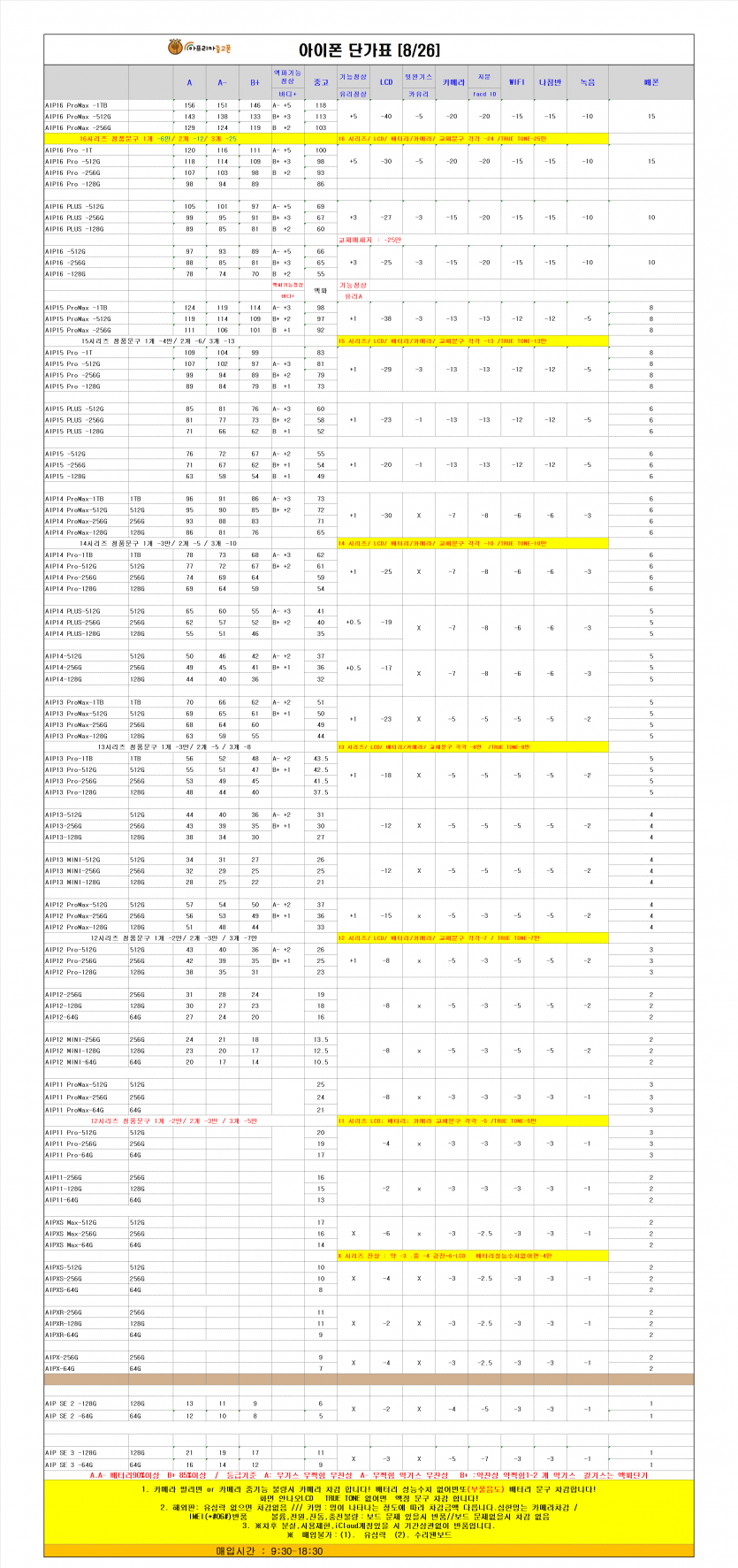 매장소식 2025년 8월 26일 중고폰 매입 단가표 작성일25.08.26 17:58 | 조회수 2,421 2025년 8월 26일 중고폰 매입 단가표 이전글2025년 9월 카드사 무이자 할부 혜택 다음글2025년 8월 22일 중고폰 매입 단가표 목록