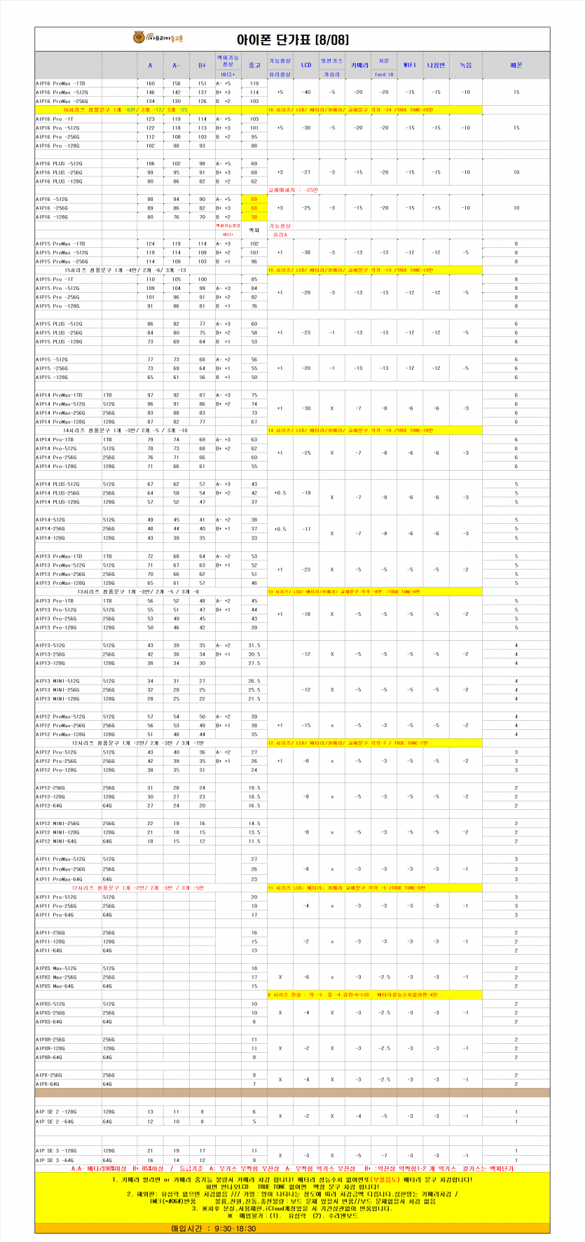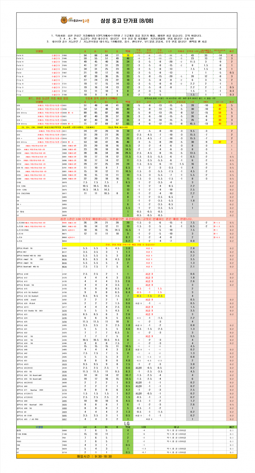 매장소식 2025년 8월 8일 중고폰 매입 단가표 작성일25.08.08 10:37 | 조회수 2,915 2025년 8월 8일 중고폰 매입 단가표 이전글2025년 8월 11일 중고폰 매입 단가표 다음글2025년 8월 카드사 무이자 할부 혜택 안내 목록