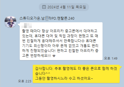 촬영 때마다 항상 아프리카중고폰에서 대여하고 있는데, 휴대폰 대여 및 픽업 과정이 편했고 또 매번 친절하게 응대해 주셔서 만족합니다.